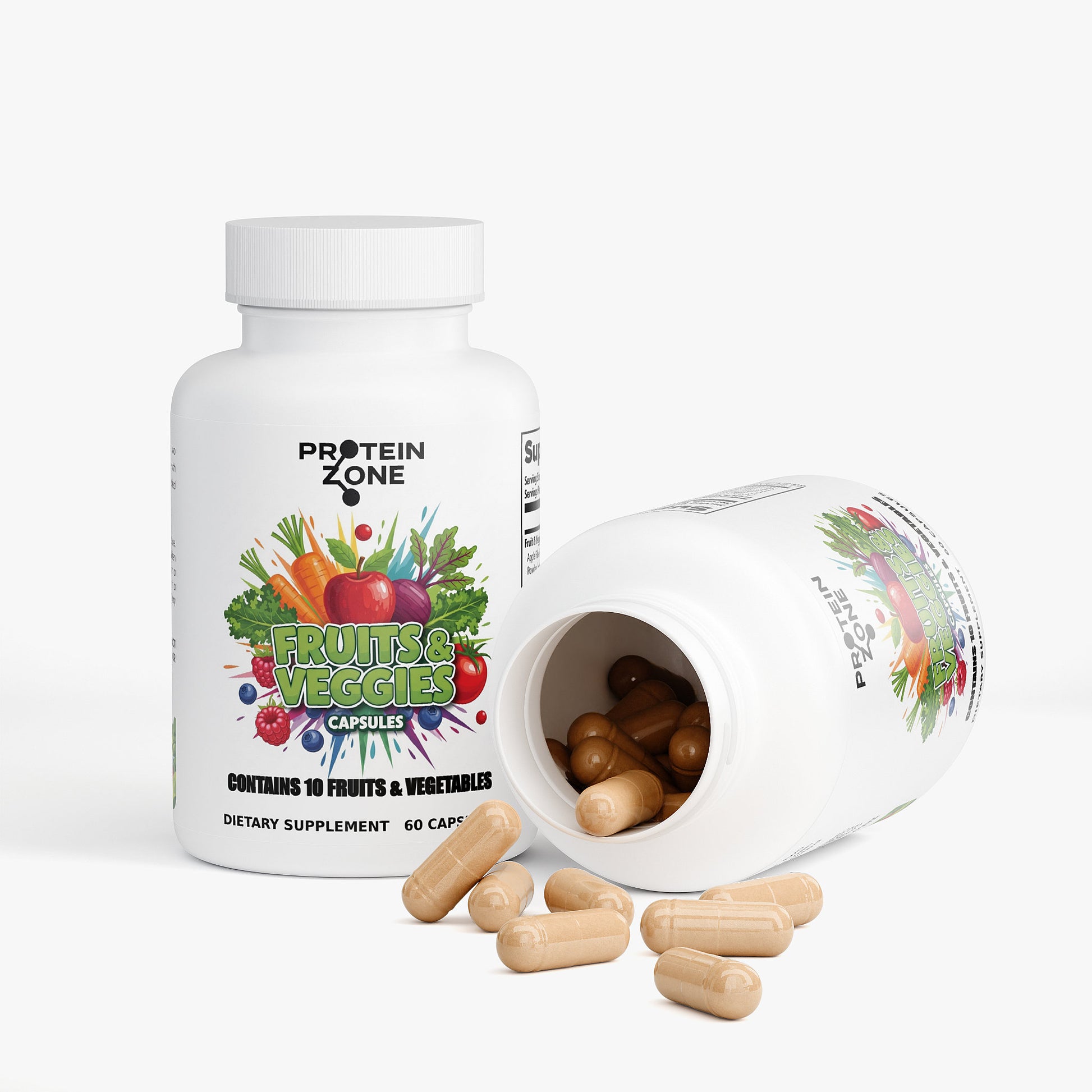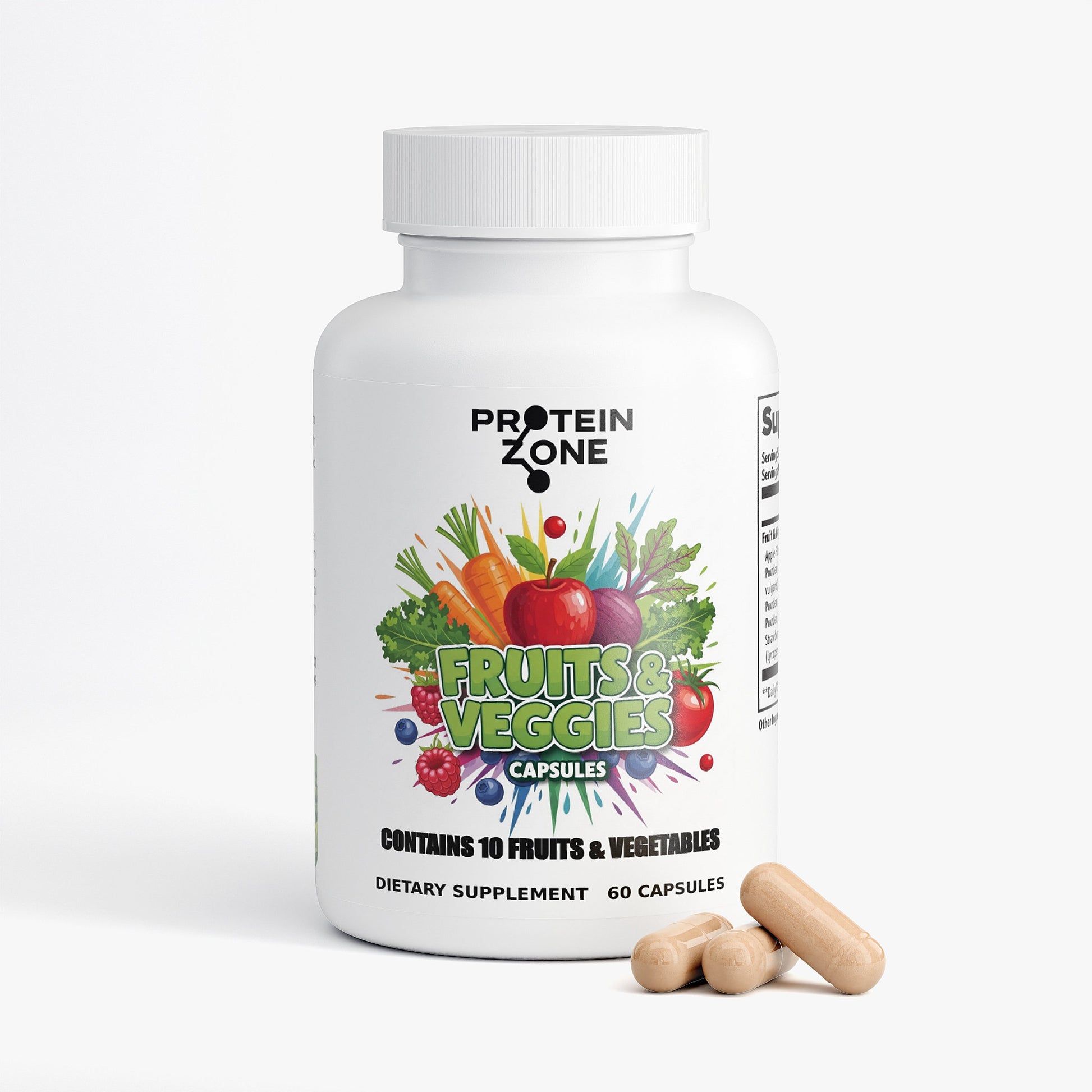 Ingredients: Apple Fiber Powder (Malus pumila) (fruit), Carrot Powder (whole carrot), Beet Root Powder (Beta vulgaris) (root), Blueberry Powder (fruit), Garlic Powder (bulb), Ginger Powder (root), Raspberry Powder (fruit), Red Bell Pepper Powder (fruit), Strawberry Juice Powder (fruit), Tomato Extract (Lycopersicon esculentum) (fruit), Gelatin (capsule), Brown Rice Flour.