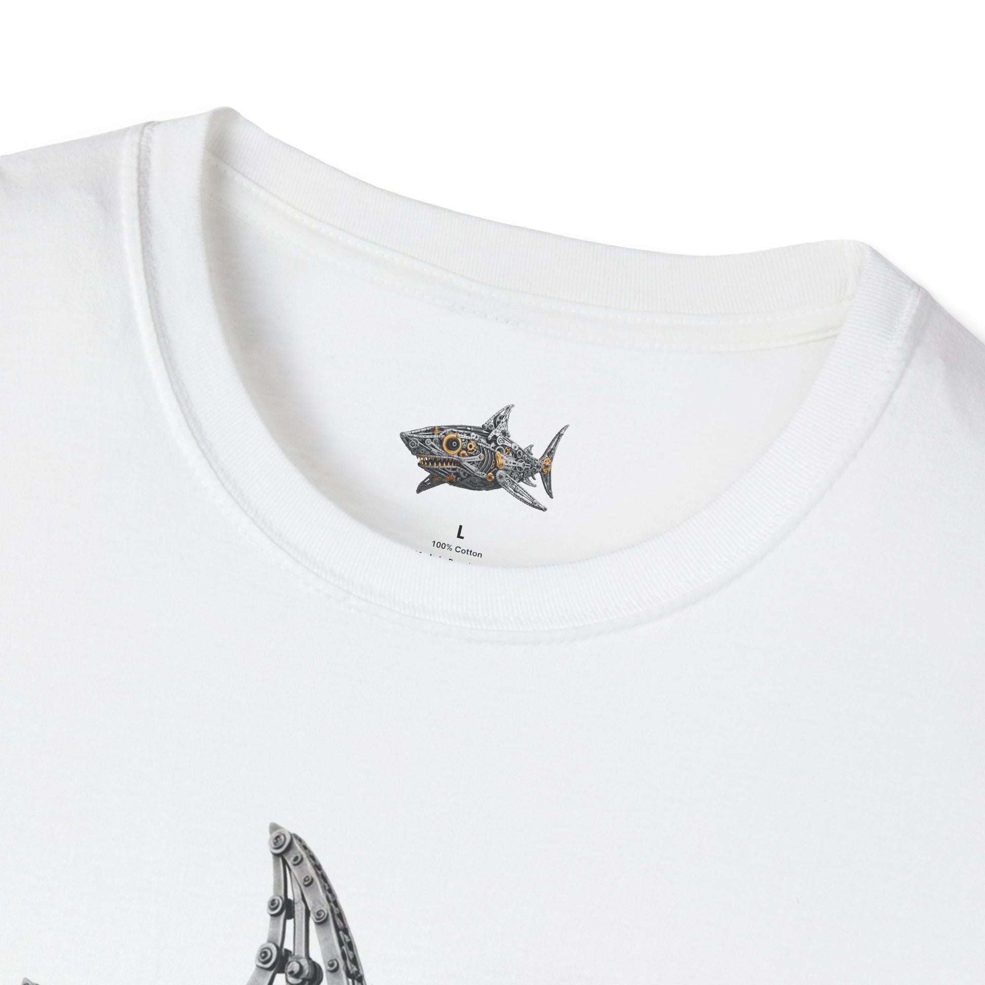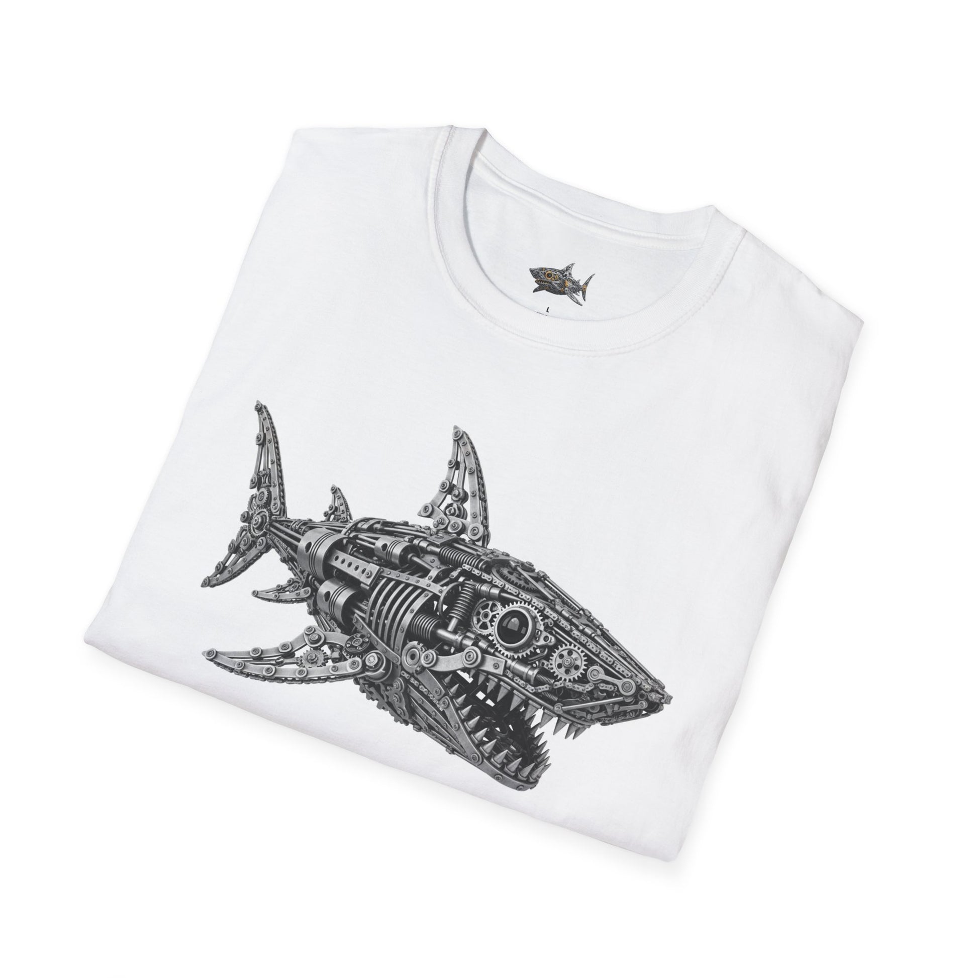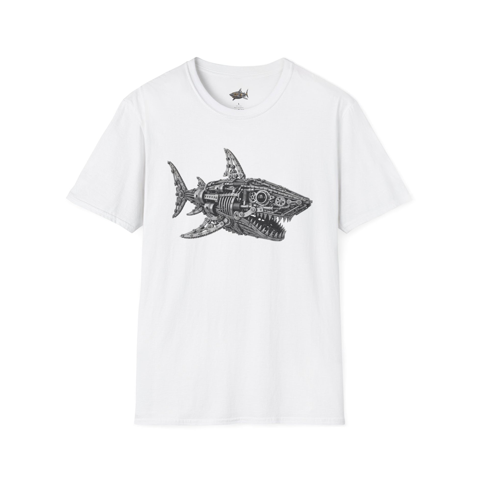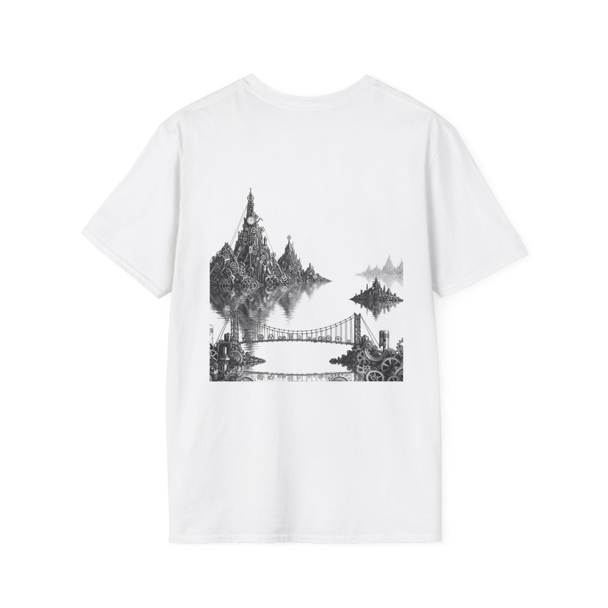 A unique black and white steampunk style design featuring a scene of a large lake with mountains made from gears and chains on a white background. This softstyle T-Shirt is perfect for those who appreciate unconventional and artistic designs, and it's ideal for casual wear or special occasions. It can be a great conversation starter and adds a touch of creativity to the wearer's outfit. Relevant for steampunk enthusiasts, art lovers, and those looking for a standout wardrobe piece. Suitable for wearing on artistic events, steampunk gatherings, casual outings, or as a unique gift for birthdays or holidays.